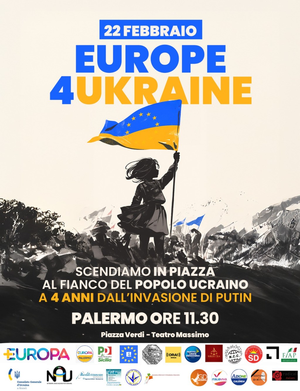 Noi europei siciliani non dobbiamo rassegnarci; in virtù del nostro privilegio abbiamo il dovere di resistere. A Palermo, per marcare la nostra presenza in solidarietà e la nostra volontà di difesa militare dell’Ucraina e dell’Europa, saremo una pluralità di soggetti che comprendono l’urgenza di questo bisogno vitale.
