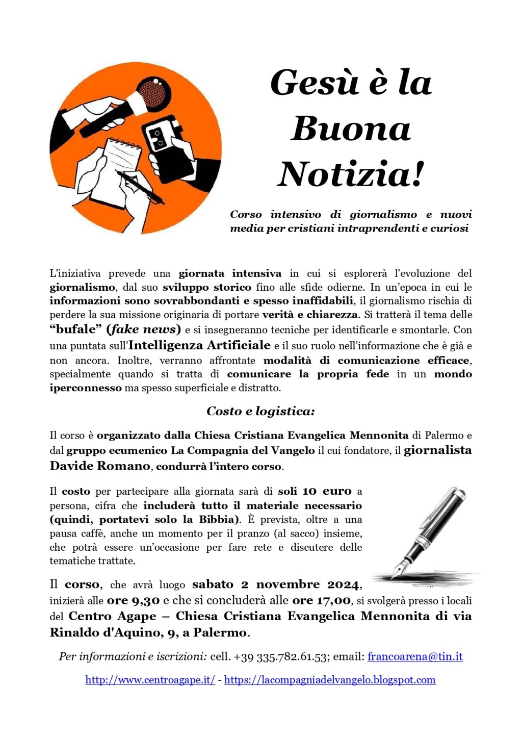 In un mondo inondato da informazioni, spesso false e fuorvianti, c’è chi desidera riportare la verità al centro della comunicazione. Ecco l’occasione perfetta per chiunque voglia esplorare il giornalismo con una prospettiva cristiana e imparare a difendersi dalle “bufale”. Il corso intensivo “Gesù è la Buona Notizia”, organizzato dalla Chiesa Cristiana Evangelica Mennonita di Palermo in collaborazione con il gruppo ecumenico La Compagnia del Vangelo, promette di essere un’esperienza formativa ricca e stimolante.