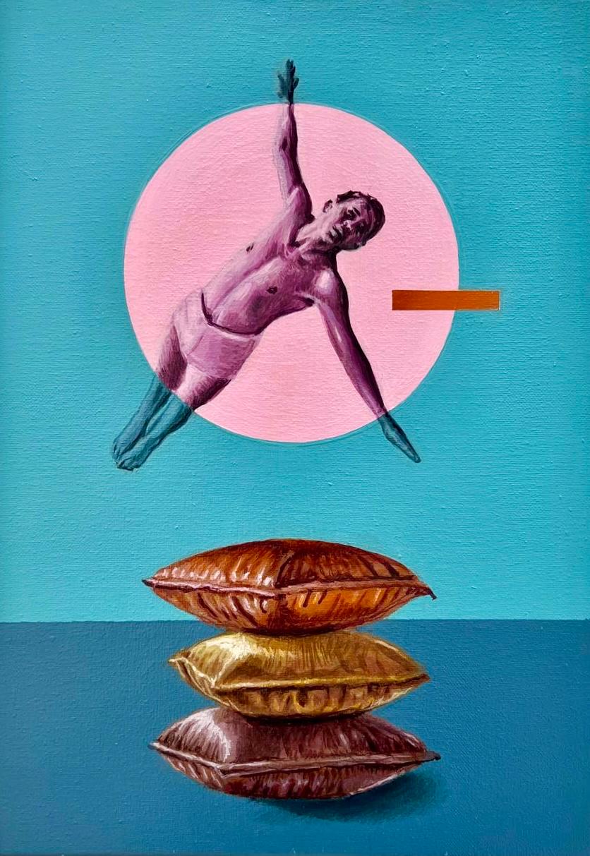 Francesco Piazza, stimato curatore d’arte contemporanea, nel testo scritto per questa mostra, così sintetizza: “Palindroma, di Andrea Buglisi, apre una riflessione sul rapporto tra peso e leggerezza, radicamento e trascendenza. Il titolo, con il suo ritmo speculare, suggerisce un enigma temporale: un eterno ritorno in cui materia e pensiero si intrecciano in una tensione poetica inesauribile. La pittura di Buglisi, erede della memoria muralista, evolve verso una dimensione rarefatta e contemplativa, trasfigurando il visibile e dischiudendo nuove possibilità interpretative. Una ricerca ispirata alla leggerezza calviniana, che scava nel profondo per offrire uno sguardo rinnovato sul mondo”.