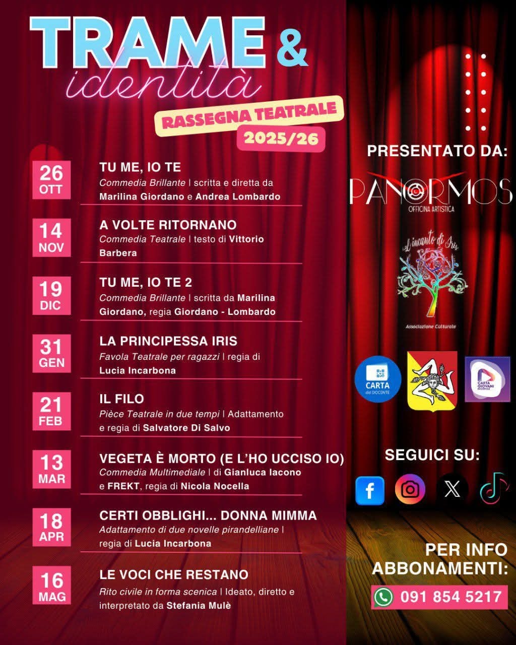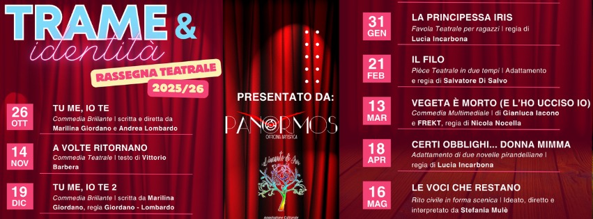 Un gesto improvviso, una battuta che taglia il silenzio e somiglia a qualcosa che ci portiamo dentro, un’emozione mai espressa che, all’improvviso, qualcuno ci restituisce dal palco. “Trame e Identità”, la rassegna teatrale 2025-26 di Panormos Officina Artistica in collaborazione con L’Incanto di Iris, nasce così, come un mosaico di vite che si intrecciano sul palco, fatte di sogni mancati, famiglie strambe, risate e solitudine.