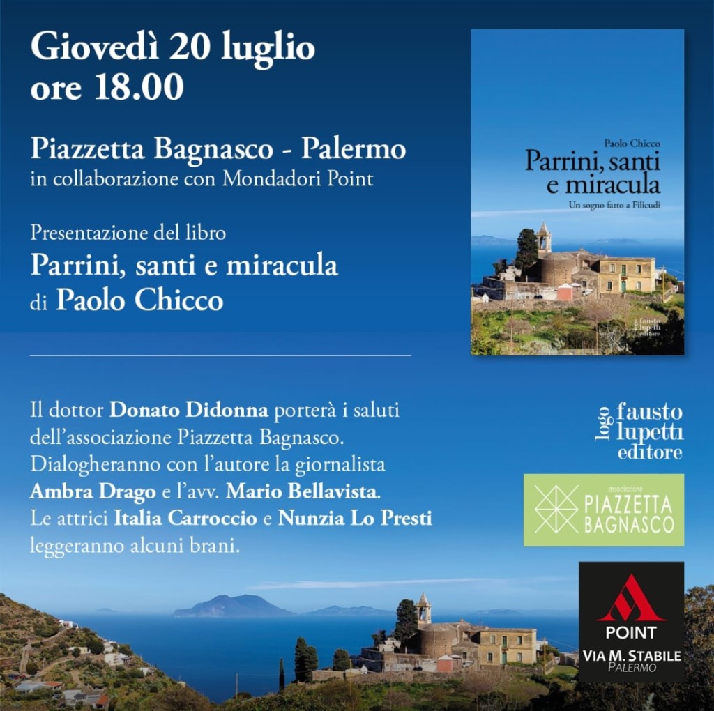 “Parrini, santi e miracula” Un sogno fatto a Filicudi scritto da Paolo Chicco sarà presentato giovedì 20 luglio alle ore 18,00 a Piazzetta Bagnasco a Palermo. Un evento in collaborazione con Mondadori Point. All’incontro dialogheranno con l’autore la giornalista Ambra Drago e l’avvocato Mario Bellavista. Il dottor Donato Didonna porterà i saluti dell’associazione Piazzetta Bagnasco. Sono previsti momenti di lettura di alcuni brani del libro affidati alla professionalità delle attrici Italia Carroccio e Nunzia Lo Presti. “I personaggi dell’isola con i loro caratteri e le loro disavventure, formano gli ingredienti naturali del romanzo che si combinano, tra sacro e profano, nella commedia umana recitata sul palcoscenico di Filicudi” così si legge nella quarta di copertina. Questa è la chiave di lettura di questo romanzo ambientato sulla piccola isola delle Eolie dove “ I fatti e le storie vere, come ha sottolineato Chicco sono state riadattati”. Un’isola che Chicco ha conosciuto sin da ragazzo e non ha mai lasciato. Una passione per la scrittura quella di Paolo Chicco, classe 51’ avvocato penalista torinese che lo porta nella vita a innamorarsi di Filicudi. Ecco che nel 2023 porta a compimento questo libro che sarà presentato e che in precedenza vede altre due pubblicazioni nella stessa collana. Nel 2012”La maledizione di Mezzapica” e nel 2021 “Mavarìa” a Filicudi sempre per il logo fausto lupetti editore . Ma è un percorso ben più ampio quello di Paolo Chicco nella stessa collana “Settevoci” pubblica nel 2016 “Le mura di Tramontana” ( Premio internazionale Città di Cuneo e Chambéry- Savoie 2016), nel 2017 lo “Strabismo di Venere” entrambi ambientati nella zona di Trapani. .