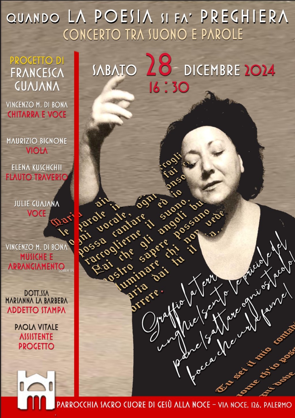 “Quando la poesia si fa preghiera”: è il titolo del concerto tra suono e parole che si terrà a Palermo sabato 28 dicembre alle 16:30 negli spazi della Parrocchia Sacro Cuore di Gesù alla Noce, in via Noce 126.