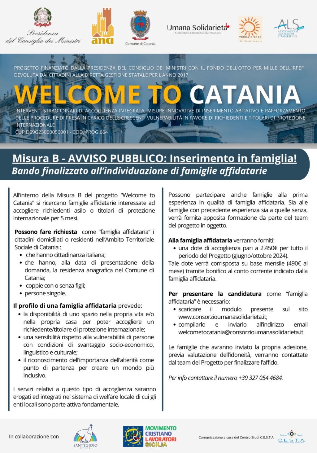 Il progetto “Welcome to Catania”, promosso dall’ANCI e finanziato dalla Presidenza del Consiglio dei Ministri (a valere sul fondo dell’otto per mille dell’IRPEF devoluta dai cittadini alla diretta gestione statale per l’anno 2017) alla Direzione Famiglia e Politiche sociali del Comune di Catania, e gestito dal Consorzio Umana Solidarietà s.c.s, in partnership con Terra e Sole La Rinascita s.c.s. e ALS MCL Sicilia, e in collaborazione con la Comunità di Sant’Egidio – Sicilia ODV ET e MCL Sicilia, bandisce un avviso pubblico per la Misura B che prevede l’inserimento in famiglia attraverso l’individuazione di famiglie affidatarie disposte ad accogliere richiedenti asilo o titolari di protezione internazionale per un periodo di 5 mesi.