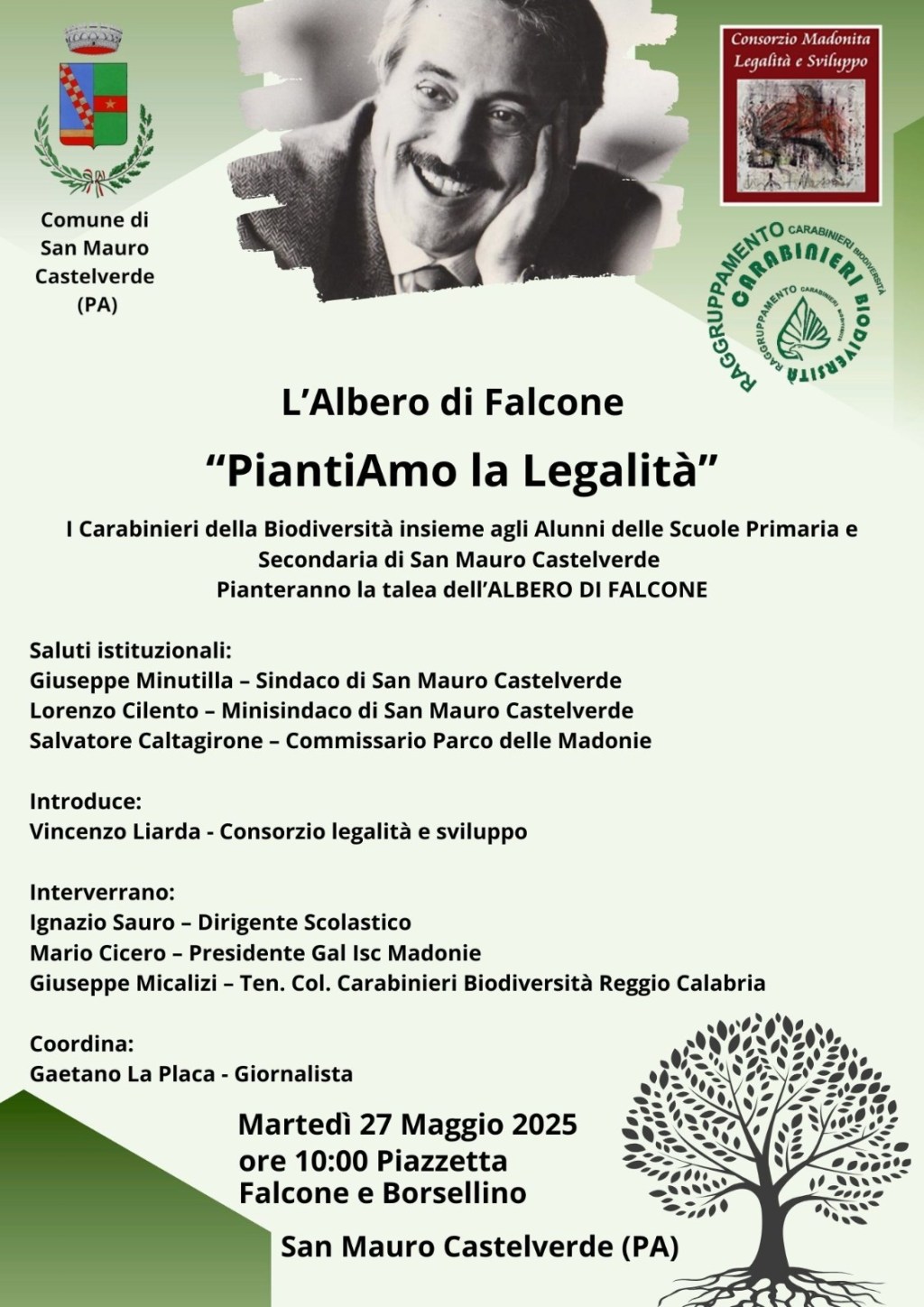 Durante la manifestazione sarà piantata la talea del celebre Albero di Falcone, simbolo della memoria e della lotta alla mafia, cresciuto davanti alla casa del giudice Giovanni Falcone, assassinato il 23 maggio 1992 nella strage di Capaci. L’iniziativa, promossa in collaborazione con il Raggruppamento Carabinieri Biodiversità, il Comune di San Mauro Castelverde e il Consorzio Madonita Legalità e Sviluppo, prevede gli interventi istituzionali di Giuseppe Minutilla, Sindaco di San Mauro Castelverde, Lorenzo Cilento, Minisindaco di San Mauro Castelverde e Salvatore Caltagirone, Commissario del Parco delle Madonie.