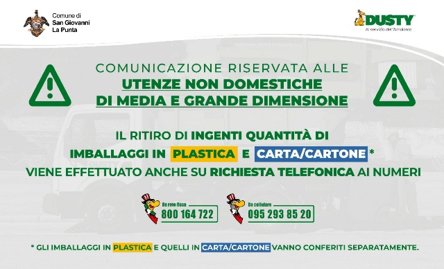 Dusty comunica che le utenze non domestiche di medie e grandi strutture di vendita del Comune di San Giovanni La Punta (Ct) avranno un’ulteriore possibilità di conferire grandi quantitativi di plastica (PAP) e di imballaggi in carta e cartone. Qualora, infatti, il ritiro di una volta a settimana previsto dal calendario dovesse risultare insufficiente, sarà possibile richiedere un intervento straordinario di raccolta chiamando da rete fissa il numero verde 800164722 oppure da cellulare il numero 0952938520. Dusty precisa che le due frazioni dovranno essere conferite separatamente. In tutti gli altri casi, resta garantito il servizio di raccolta porta a porta, come previsto da calendario.