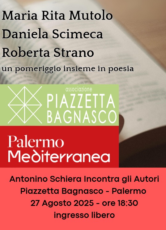 Un pomeriggio di poesia declinato al femminile. Si svolgerà mercoledì 27 agosto quando, a partire dalle 18.30, il poeta Antonino Schiera incontrerà le poetesse Mara Rita Mutolo, Daniela Scimeca e Roberta Strano. Quella che prenderà vita sarà una sorta di staffetta, durante la quale le protagoniste risponderanno su quello che vuol dire la poesia e quale messaggio amano mandare attraverso essa.