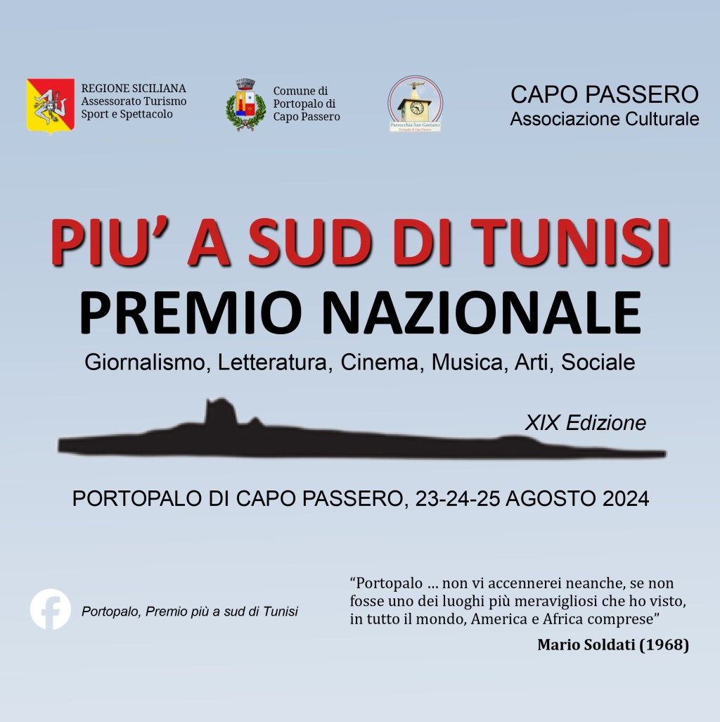 Si rinnova l’appuntamento estivo con il Premio Nazionale Più a Sud di Tunisi che si terrà a Portopalo di Capo Passero dal 23 al 25 agosto 2024. La rassegna, giunta alla XIX edizione, è uno degli appuntamenti culturali più prestigiosi del Sudest siciliano, tra giornalismo e letteratura, con digressioni nel campo del cinema, della musica e delle arti. Il Premio è patrocinato dall’Assessorato Regionale al Turismo, Sport e Spettacolo e dal Comune di Portopalo.
