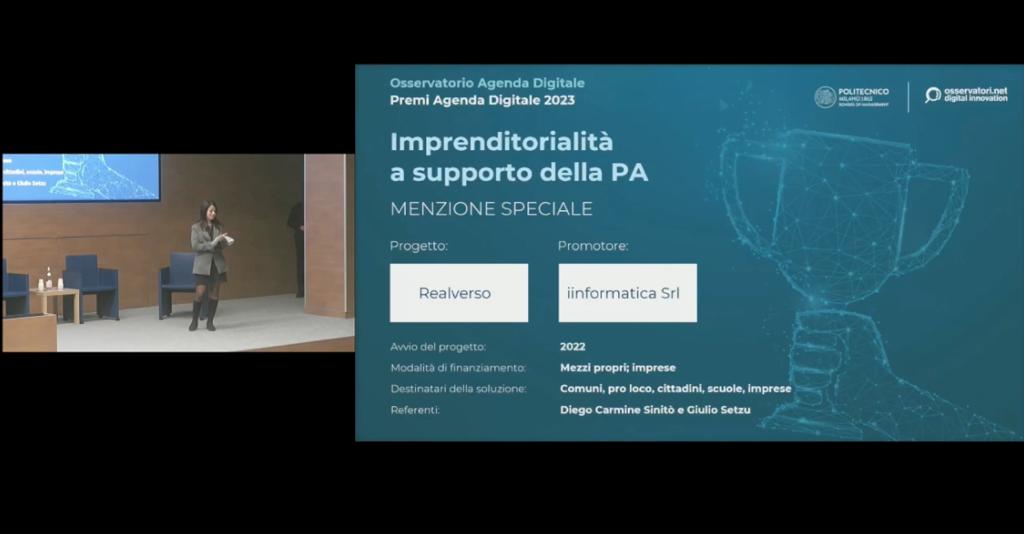 In questo prestigioso contesto, la PMI Innovativa Siciliana iInformatica ha ricevuto una menzione speciale della giuria nella categoria “Imprenditorialità al servizio delle PA”, grazie al suo progetto Realverso, il metaverso della sostenibilità già vincitore del premio Top of the PID 2023 nella categoria relativa al turismo. Il Realverso è uno spazio digitale in cui è possibile è possibile creare il proprio avatar e visitare i borghi più caratteristici della Basilicata e della Sicilia, il tutto diffondendo la cultura e le usanze dei luoghi riprodotti e invitando gli utenti a visitarli dal vivo, ed educando i propri utenti all’attuazione di comportamenti sostenibili, come la corretta differenziazione dei rifiuti e la lotta allo spreco idrico, promuovendo inoltre gli obiettivi dell’Agenda ONU 2030.