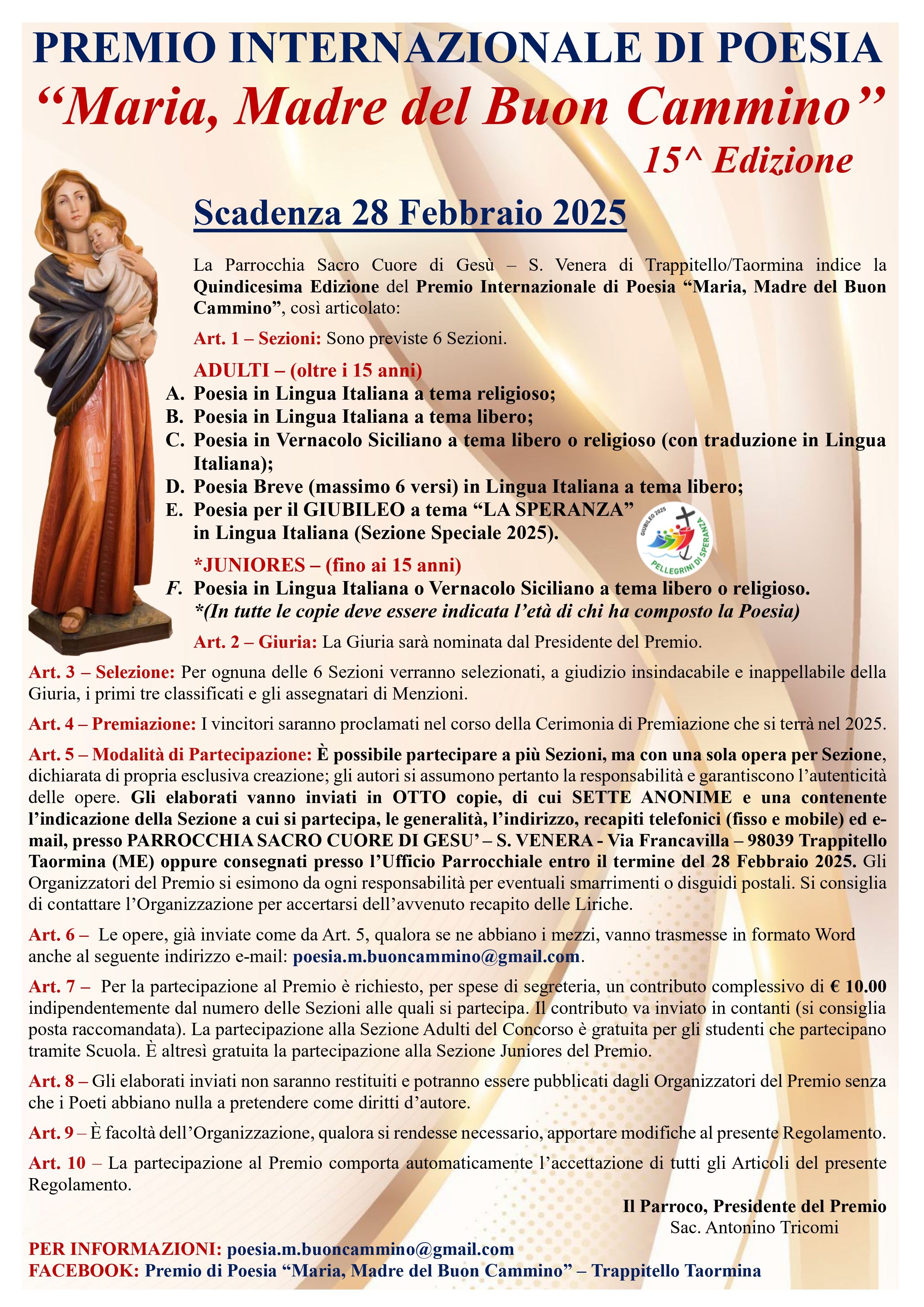 Sabato 23 Novembre scorso si è rinnovato l’appuntamento con la Cerimonia di Premiazione del Premio Internazionale di Poesia “Maria, Madre del Buon Cammino”, giunto alla Quattordicesima Edizione. Il certamen letterario, promosso dalla Parrocchia Sacro Cuore di Gesù – S. Venera di Trappitello Taormina (ME), guidata dal Sac. Padre Tonino Tricomi, è organizzato da Massimo Manganaro, Gioacchino Aveni, Agnese D’Amore e Massimo Mobilia. Un concorso consolidato e di prestigio, al quale hanno partecipato Poeti provenienti da tutta Italia e dall’estero.