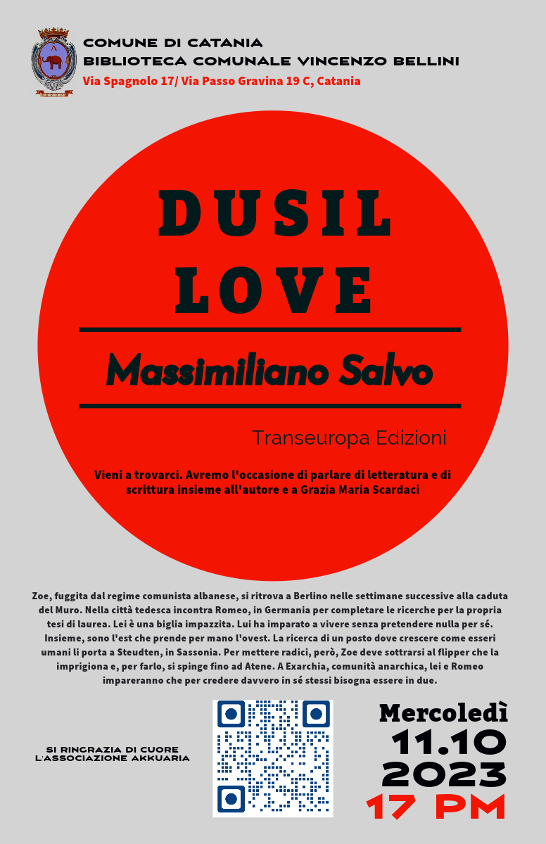 Scopri il nuovo romanzo di Massimiliano Salvo, Dusil love, edito da Transeuropa Edizioni. Vieni a trovarci. Avremo l’occasione di parlare di letteratura e scrittura con l’autore e con Grazia Maria Scardaci e Vera Ambra