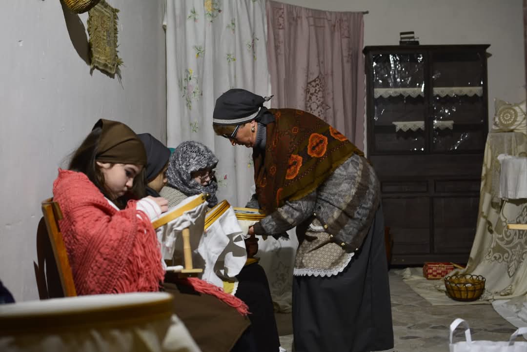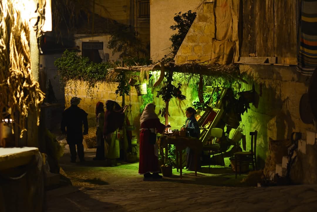 Abbiamo ricostruito un villaggio di circa 80mq, quattro le strade su cui si sviluppa il presepe, oltre dieci le attività che troverete la taverna, il panificio, il mercato, la macelleria, il lavatoio, l’allevamento con animali vivi e oltre ottanta le figure che animeranno il villaggio.