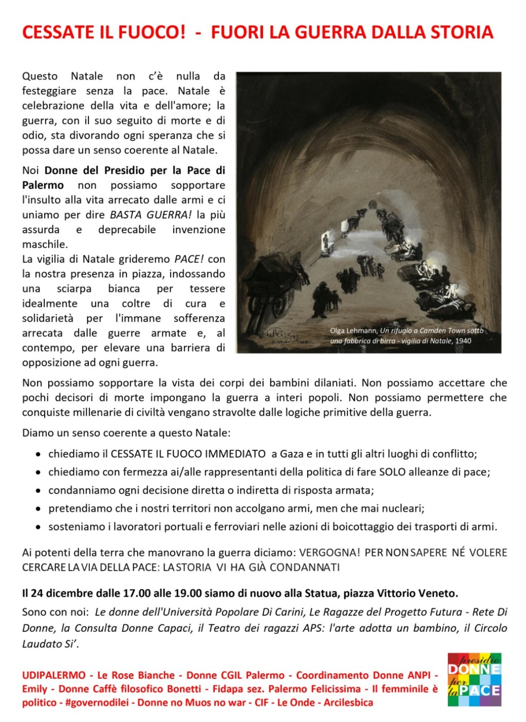 CESSATE IL FUOCO! – FUORI LA GUERRA DALLA STORIA. Il Presidio Donne della Pace domenica 24 dicembre dalle 17.00 alle 19.00 alla Statua, piazza Vittorio Veneto a Palermo