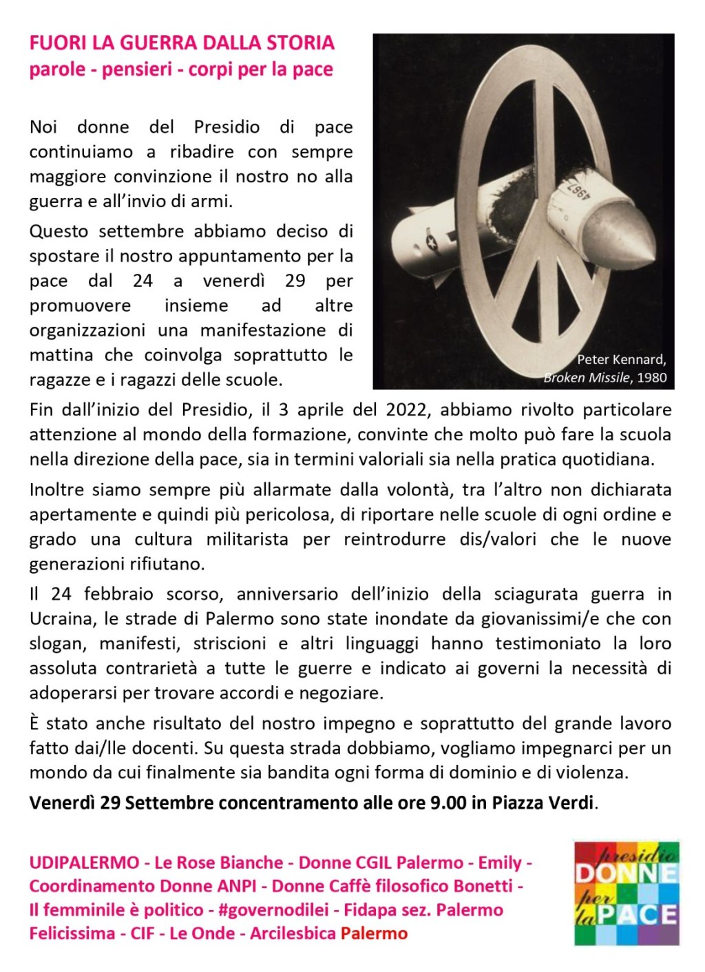 Presidio donne per la pace: in piazza domani venerdì 29 settembre per dire ‘no’ alla guerra. Concentramento alle ore 9 in piazza Verdi – Palermo.