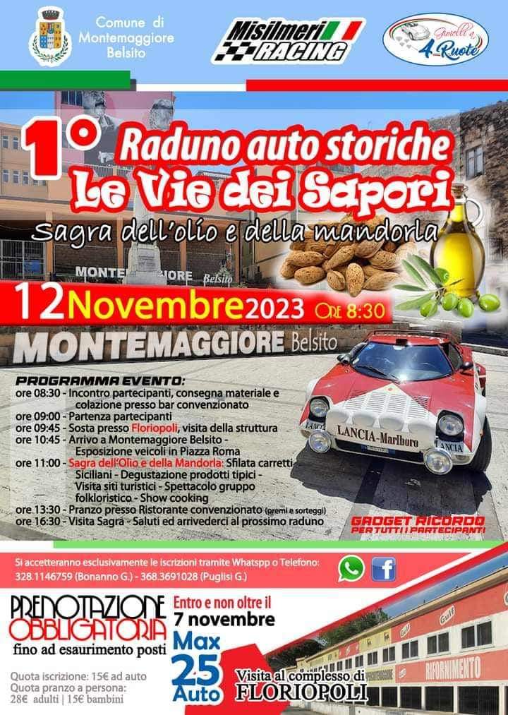 Il 12 Novembre 2023 , in occasione della Sagra dell’olio e della mandorla, a Montemaggiore Belsito, si terra’ il “Primo raduno auto storiche, le vie dei sapori (Misilmeri Rancing, Gioielli a 4 Ruote). Una bellissima fusione tra le diverse passioni che attireranno visitatori da tutta la provincia siciliana. Un evento quello delle auto storiche ben incluso e articolato, che vedra’ i tanti piloti partecipanti riunirsi, per essere puntuali alla partenza delle ore 9,00 da Montemaggiore Belsito.