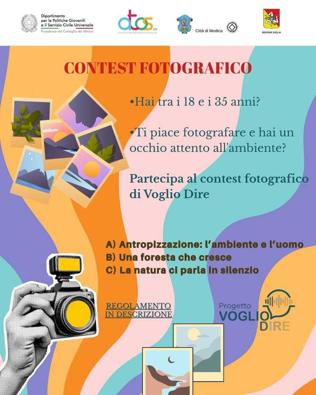 Il contest Dire Verde – Modica 2025 nasce con l’obiettivo di sensibilizzare la comunità sul tema dell’ambiente e la partecipazione è aperta a tutti i giovani residenti o domiciliati nella provincia di Ragusa. Per partecipare, è necessario inviare una email all’indirizzo progettovogliodireatos@gmail.com entro e non oltre il 12 ottobre 2025, specificando la sezione del concorso e allegando al massimo due fotografie per ciascuna sezione. Ogni partecipante può concorrere per più sezioni, inviando però una email distinta per ogni sezione. La partecipazione è gratuita e le opere inviate oltre la scadenza non saranno prese in considerazione.
