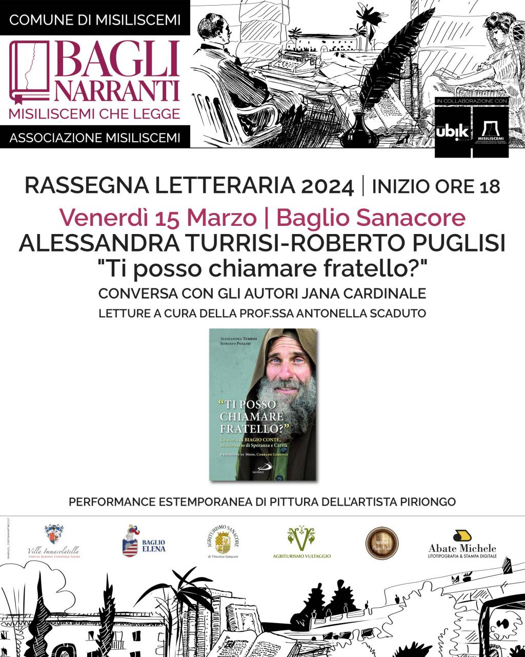 Dopo il partecipato incontro di sabato con Leoluca Orlando che ha presentato “Enigma Palermo”, la rassegna letteraria “Bagli narranti – Misiliscemi che legge” organizzata dall’Associazione “Misiliscemi” in collaborazione con il Comune e la libreria Ubik di Erice, prosegue venerdì 15 marzo, sempre alle ore 18 – questa volta a baglio Sanacore – con la presentazione di “Ti posso chiamare fratello”? dei giornalisti Alessandra Turrisi e Roberto Puglisi, un volume dedicato all’impegno presso la Missione Speranza e Carità di Palermo di Biagio Conte, il missionario che ha dedicato la sua vita ai poveri.