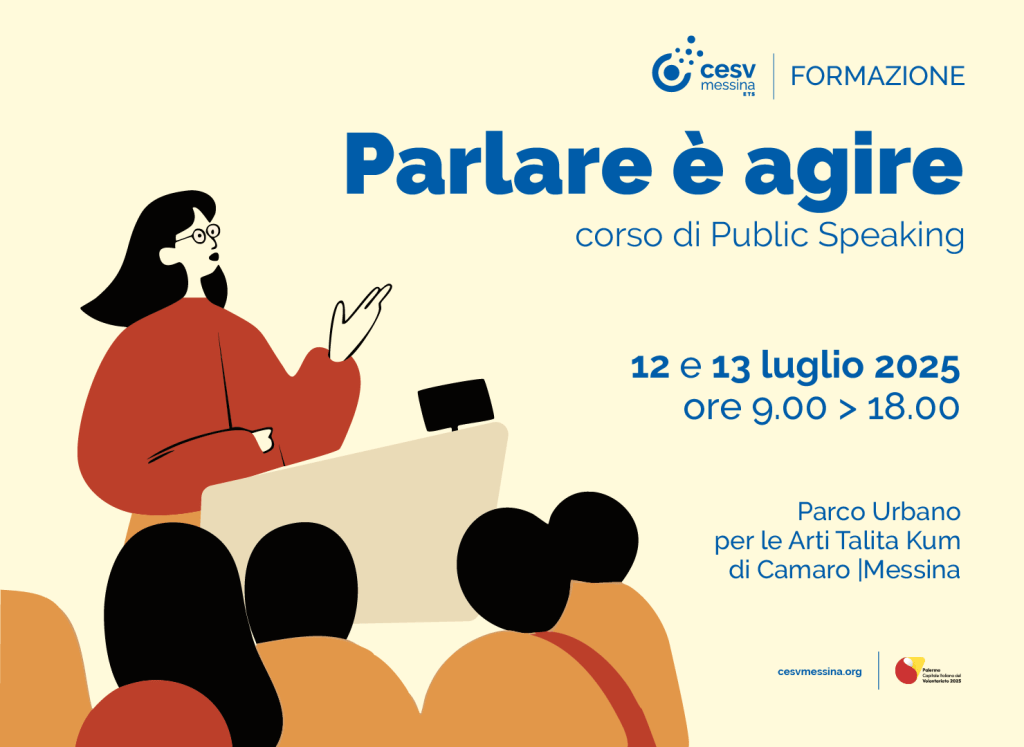 “Parlare è agire” si svolgerà nei giorni 12 e 13 luglio nel Parco Urbano per le Arti Talita Kum di Camaro, Messina. È già possibile iscriversi al corso tramite area riservata sul sito web del CESV.