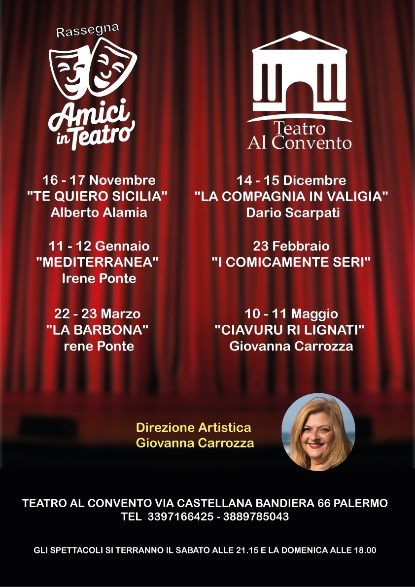 Ha inizio il 16 novembre alle 21,15 al teatro Al Convento in via Castellana Bandiera 66 a Palermo la rassegna “Amici in teatro” diretta da Giovanna Carrozza.