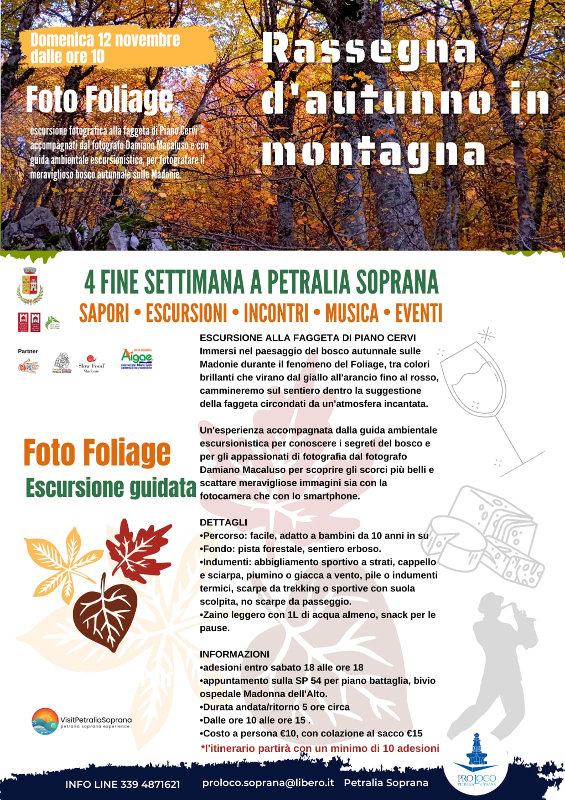 Il calendario, programmato dalla Proloco di Petralia Soprana con il patrocinio del Comune, prevede per Sabato 11, ore 19.30, “IN VERITAS” SEGRETI E SAPERI DEL VINO. Un incontro per conoscere il vino di montagna e la storia di aziende del territorio con degustazione guidata a cura della cantina Tenuta San Giaime di Gangi. Ore 22.00 concerto MUSIC LIVE ACUSTICO dei BPV band. Domenica 12 alle ore 10.30 FOTO FOLIAGE, escursione fotografica alla faggeta di Piano Cervi accompagnati dalle guide ambientali escursionistica insieme al fotografo Damiano Macaluso, nell’atmosfera straordinaria del fenomeno del FOLIAGE nei boschi del Parco delle Madonie.