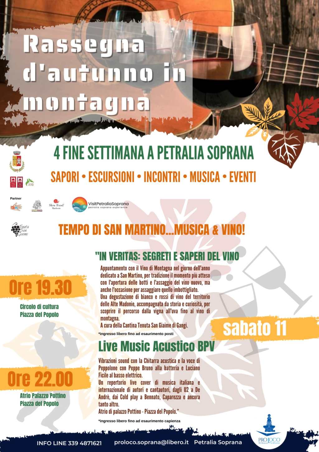 Il calendario, programmato dalla Proloco di Petralia Soprana con il patrocinio del Comune, prevede per Sabato 11, ore 19.30, “IN VERITAS” SEGRETI E SAPERI DEL VINO. Un incontro per conoscere il vino di montagna e la storia di aziende del territorio con degustazione guidata a cura della cantina Tenuta San Giaime di Gangi. Ore 22.00 concerto MUSIC LIVE ACUSTICO dei BPV band. Domenica 12 alle ore 10.30 FOTO FOLIAGE, escursione fotografica alla faggeta di Piano Cervi accompagnati dalle guide ambientali escursionistica insieme al fotografo Damiano Macaluso, nell’atmosfera straordinaria del fenomeno del FOLIAGE nei boschi del Parco delle Madonie.
