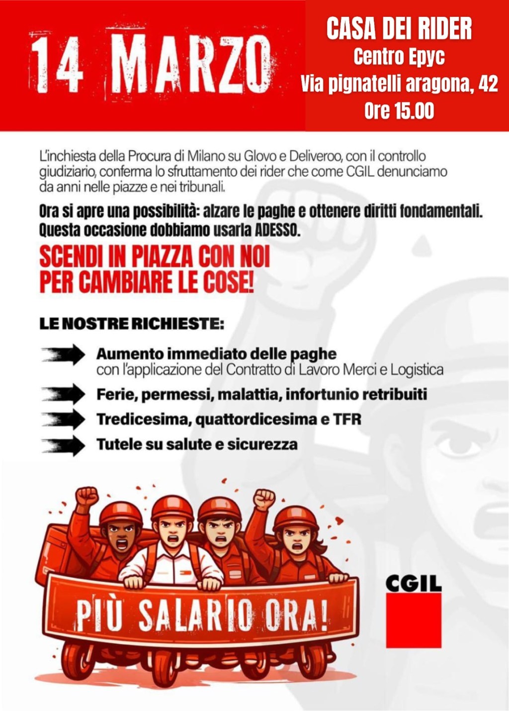 Palermo 12 marzo 2026 – Sabato 14 marzo, in occasione della giornata di mobilitazione nazionale dei rider indetta dalla Cgil, a Palermo si terrà un’assemblea alla Casa dei Rider, alle 15, presso l’Epyc, in via Pignatelli Aragona, 42. La Cgil, a seguito dell’indagine della Procura di Milano sulle piattaforme Glovo e Deliveroo, rilancia l’iniziativa sindacale per trasformare la fase aperta dall’indagine giudiziaria in una concreta opportunità di cambiamento delle condizioni di lavoro nel settore del delivery.