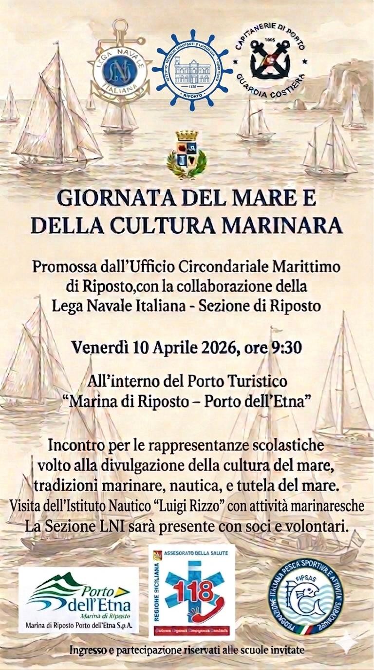 Si terrà domani mattina, venerdì 10 aprile, a partire dalle ore 9.30, nel Porto Turistico ‘Marina di Riposto – Porto dell’Etna’, la Giornata del Mare e della Cultura Marinara, promossa dall’Ufficio Circondariale Marittimo di Riposto con la collaborazione della Lega Navale Italiana – Sezione di Riposto.