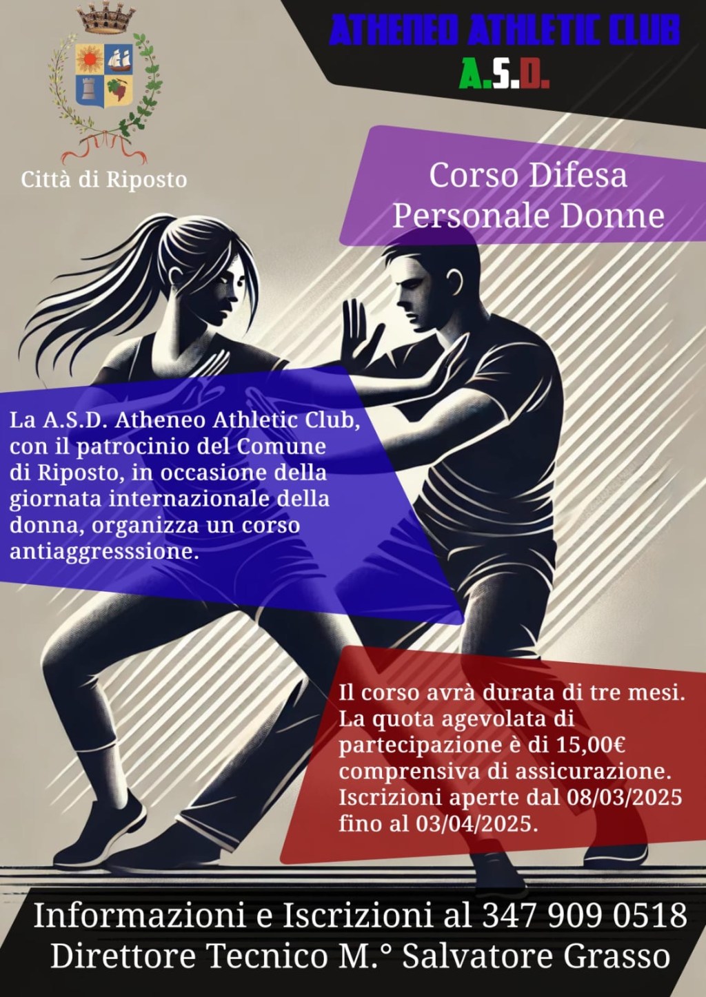 In occasione della Giornata internazionale della donna, l’A.S.D. Atheneo Athletic Club organizza, con il patrocinio del Comune di Riposto, un corso di difesa personale femminile. Le iscrizioni al corso, che durerà tre mesi, si apriranno sabato 8 marzo e si chiuderanno giovedì 3 aprile. Prevista una quota agevolata per la partecipazione pari a 15 euro, comprensiva di quota assicurativa. “Aiutare le donne ad acquisire alcune tecniche basilari, ma fondamentali, può contribuire a dar loro maggiore sicurezza e consapevolezza – spiega il sindaco Davide Vasta – La prevenzione e anche l’atteggiamento che si assume in situazioni critiche possono aiutare a fronteggiare un’azione violenta. Il nostro auspicio è che le donne che parteciperanno a questo corso – conclude il primo cittadino – possano consolidare la fiducia in sé stesse e nelle proprie capacità”.