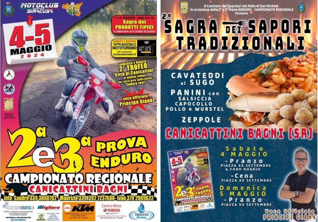 Fa ritorno a Canicattini Bagni sabato 4 e domenica 5 maggio 2024 il Campionato regionale Enduro 2024 della FMI, Federazione Motociclistica Italiana, con la 2° e 3° prova organizzata dal Motoclub Siracusa presieduto da Antonio Ingarao e il “2° Trofeo Città di Canicattini Bagni” istituito dall’Amministrazione comunale del Sindaco Paolo Amenta e assegnato al miglior tempo del terzo giro sulla prova “Enduro test”.