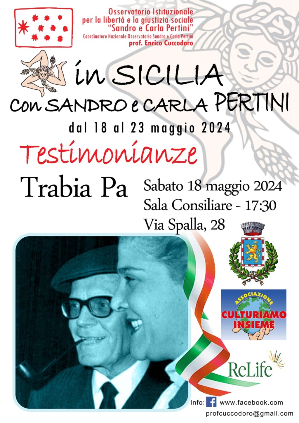 Sabato 18 Marzo a Trabia,nei locali dell’Aula Consiliare sita in Via Spalla 28,si svolgera’un evento culturale in memoria del 7°Presidente della Repubblica Sandro Pertini,denominato “Viaggio in Sicilia con Sandro e Carla Pertini”,nel corso della serata verra’anche presentato il libro in ricordo dello Statista Socialista “Gli impertinenti”scritto dal Prof.Enrico Cuccodoro.