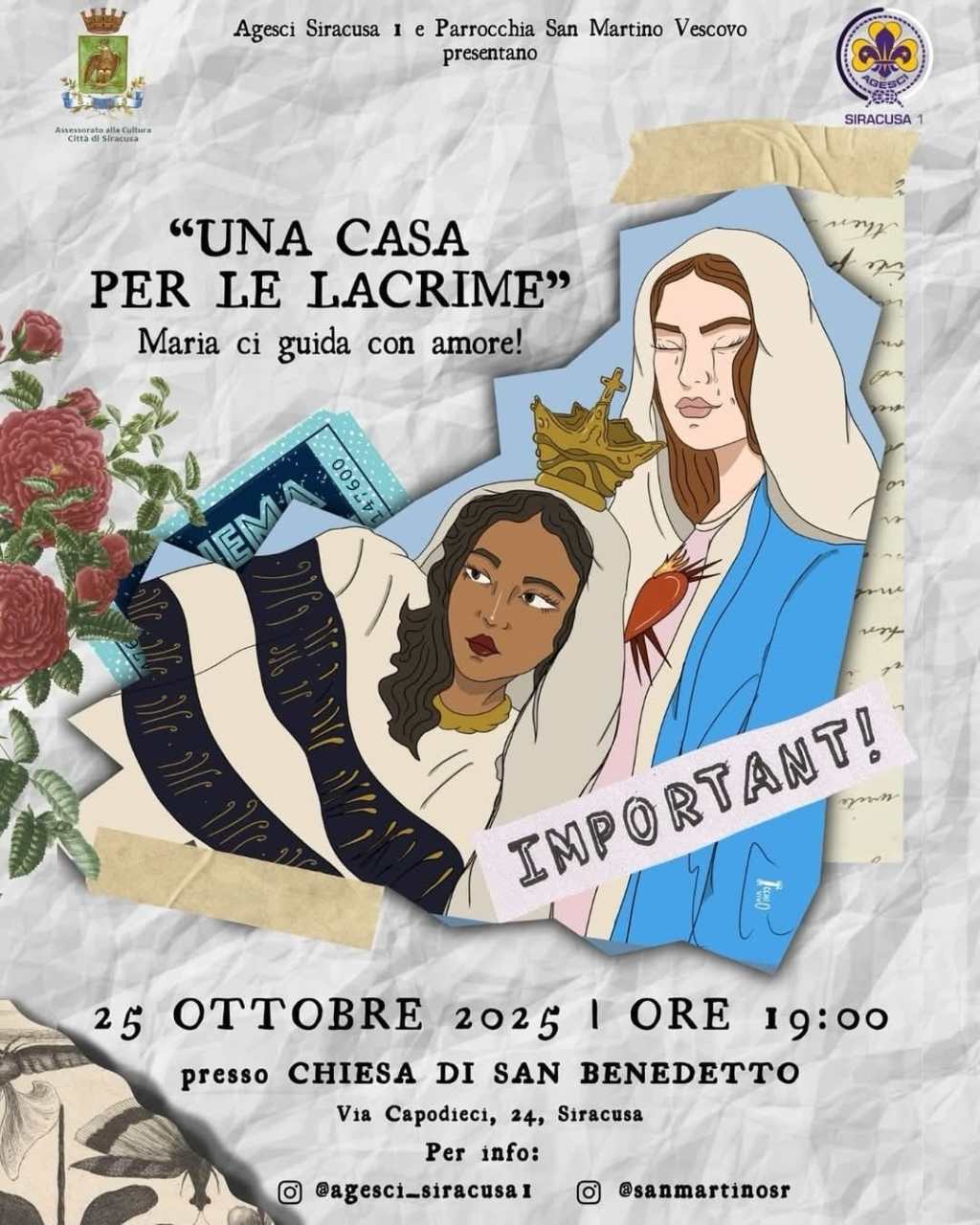 Un invito alla riflessione, alla tenerezza e alla speranza: sabato 25 ottobre 2025, alle ore 19:00, presso la Chiesa di San Benedetto (Via Capodieci 24, Siracusa), andrà in scena la performance “Una casa per le lacrime – Maria ci guida con amore”, promossa da Agesci Siracusa 1 e dalla Parrocchia San Martino Vescovo, con il patrocinio dell’Assessorato alla Cultura della Città di Siracusa.