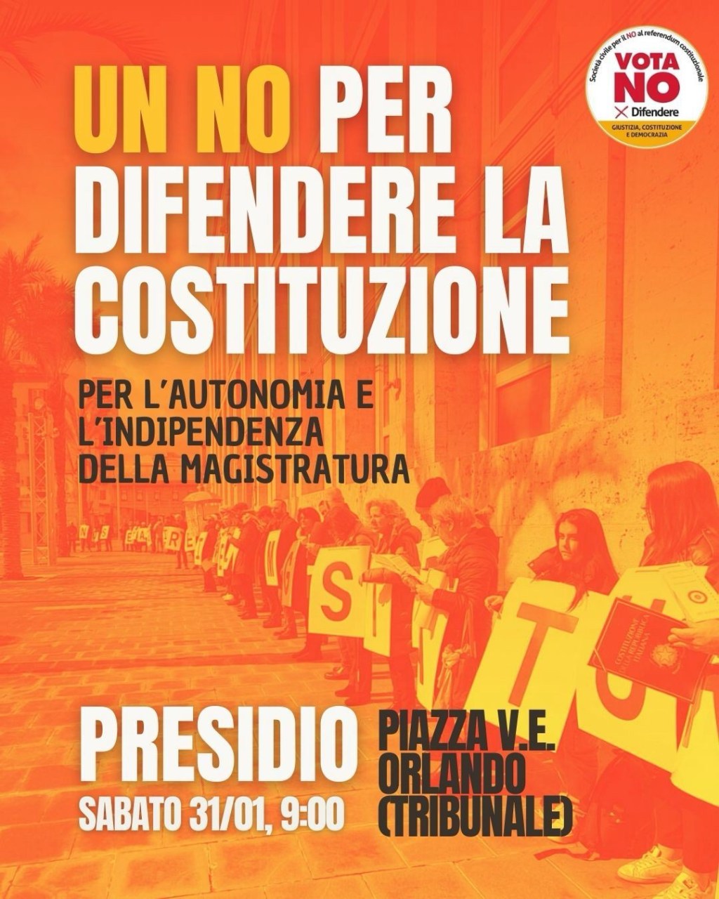 Palermo 28 gennaio 2026 – Un No per difendere la Costituzione. Per l’autonomia e l’indipendenza della magistratura. Il comitato della “Società civile per il No nel referendum costituzionale” scende in piazza sabato per difendere l’autonomia e l’indipendenza della magistratura, a garanzia dei diritti dei cittadini.