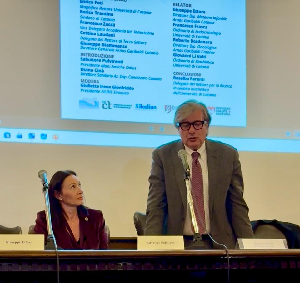Salvatore Pulvirenti, presidente di Mani Amiche Onlus, ha spiegato come il convegno nasca dall’esigenza condivisa di due realtà associative complementari: da un lato FILDIS Siracusa, espressione dell’universo femminile impegnato nello studio e nel superamento delle problematiche sociali e culturali che riguardano le donne; dall’altro Mani Amiche Onlus, da sempre attiva nel sostegno alla ricerca scientifica, in particolare oncologica. Un impegno concretizzato nel tempo attraverso la donazione di un Laboratorio di Oncologia Molecolare al Dipartimento Biometec dell’Università di Catania, il finanziamento di un progetto di ricerca contro i tumori al Dipartimento di Scienze del Farmaco, il supporto alla ricerca informatica applicata alla medicina mediante la donazione di un computer al Dottorato di Informatica dell’Ateneo catanese e l’assegnazione di borse di viaggio a studiosi che hanno partecipato alla quarta edizione del workshop SIB, promosso dalla Società Italiana di Biochimica e Biologia Molecolare insieme all’Università di Catania.