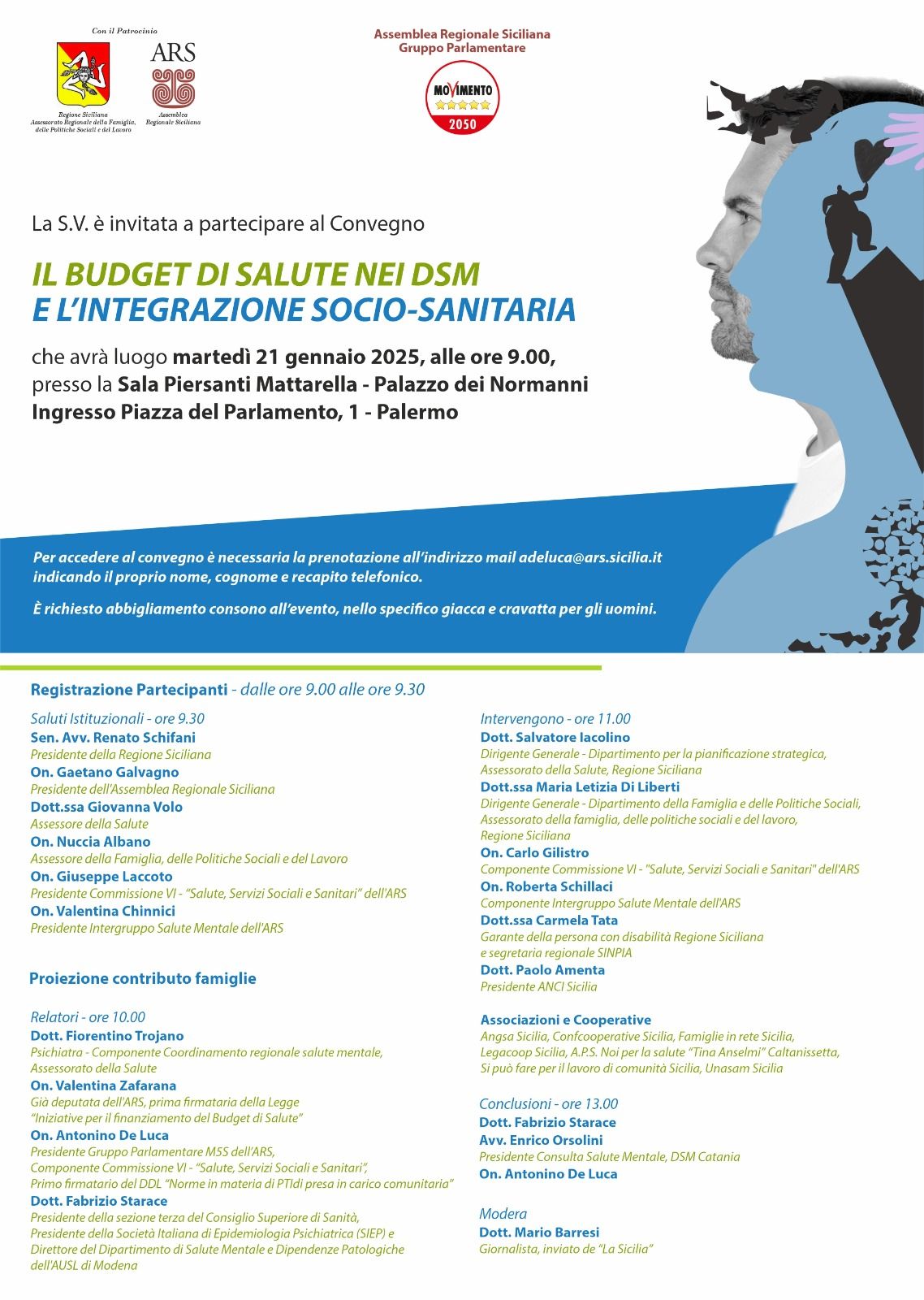 Sono previsti interventi pure di dirigenti generali degli assessorati della Salute e della Famiglia, del garante regionale della disabilità, del presidente Anci, di rappresentanti delle associazioni datoriali e delle famiglie, nonché di deputati e del presidente della Consulta sanità mentale Dsm di Catania.
