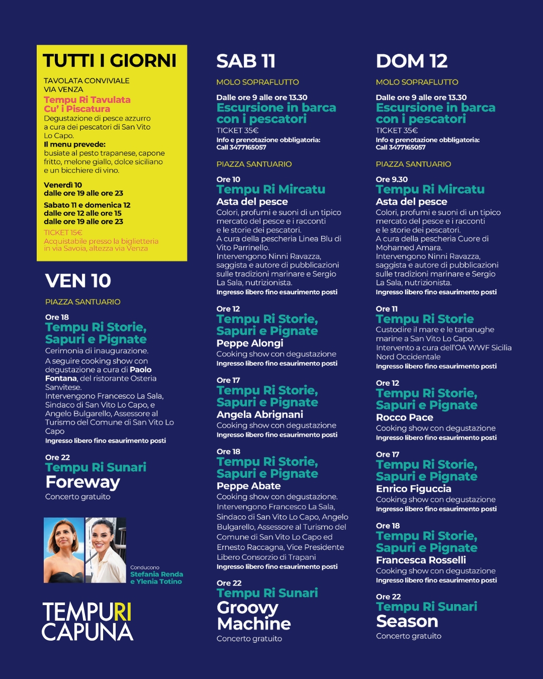San Vito Lo Capo torna a rendere omaggio al suo legame più profondo, quello con il mare e con la tradizione della pesca del pesce azzurro, con la 12^ edizione di “Tempuricapuna”, in programma da venerdì 10 a domenica 12 ottobre 2025.