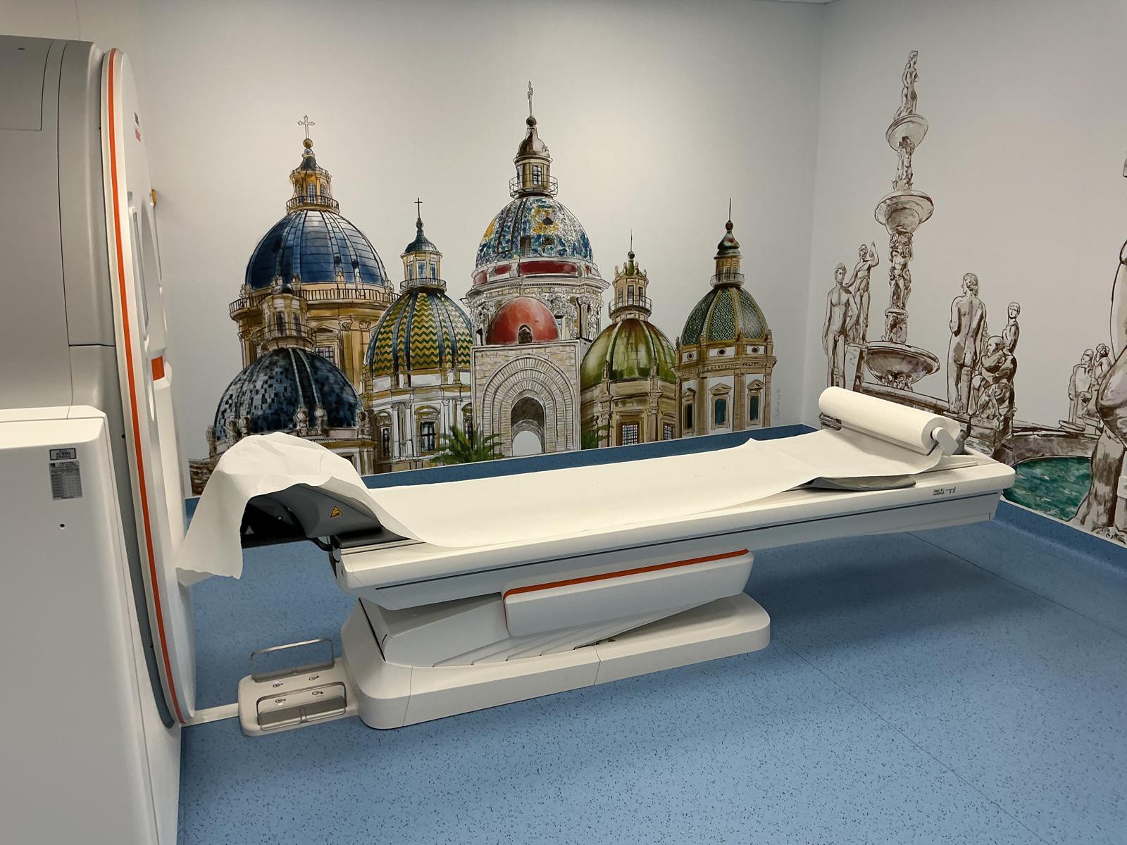 Lo spazio è uno degli elementi distintivi del nuovo servizio: l’ambiente della TAC è stato ripensato per essere più accogliente e meno “ambulatoriale”, grazie alla donazione artistica firmata da Stefano Lo Voi. L’opera raffigura le cupole delle chiese del centro storico di Palermo e piazza Pretoria, trasformando la sala diagnostica in un luogo capace di trasmettere familiarità e serenità ai pazienti.