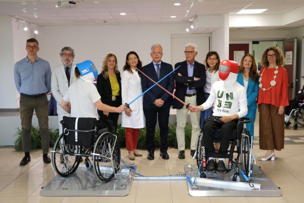 Dopo le prime dimostrazioni, la pedana è stata collocata nella palestra di attività motoria dell’Unità Spinale, a disposizione dei pazienti che, sotto la guida tecnica, volessero avvicinarsi alla pratica della scherma.