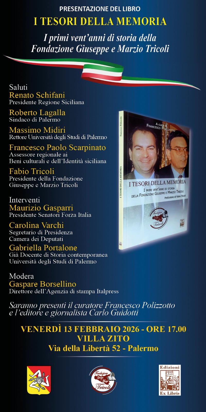 La presentazione si svolgerà a Villa Zito, in via Libertà 52. Insieme al Presidente della Fondazione Fabio Tricoli interverranno: il Presidente della Regione siciliana, Renato Schifani; il Sindaco di Palermo, Roberto Lagalla; il Presidente dei Senatori di Forza Italia, Maurizio Gasparri; il Rettore dell’Università di Palermo, Massimo Midiri; l’Assessore ai Beni culturali e all’Identità siciliana Francesco Paolo Scarpinato; il Segretario di Presidenza della Camera dei Deputati, Carolina Varchi; il Direttore dell’agenzia di stampa Italpress Gaspare Borsellino; la Professoressa Gabriella Portalone; il Curatore Francesco Polizzotto; l’Editore e Giornalista Carlo Guidotti.