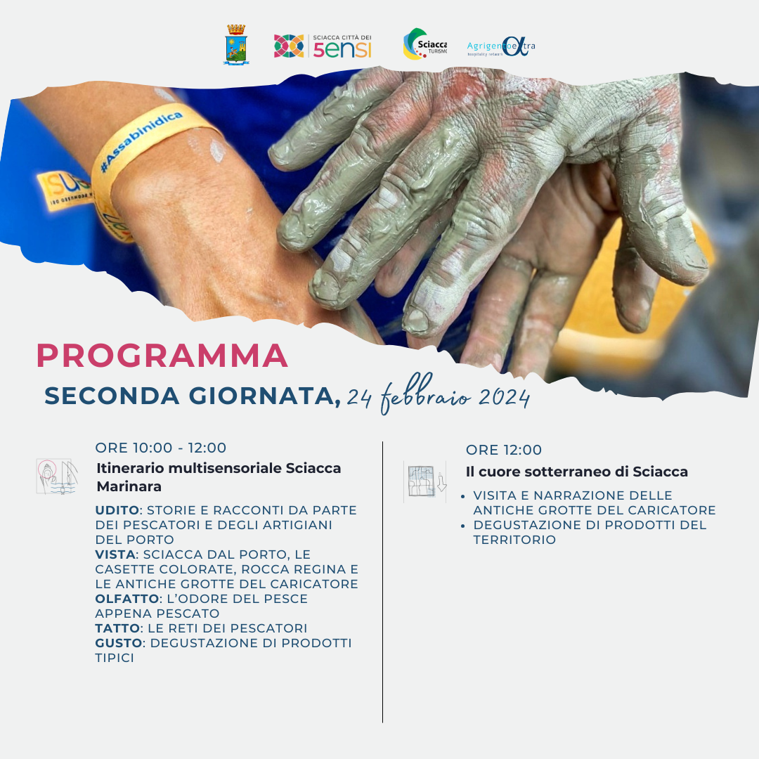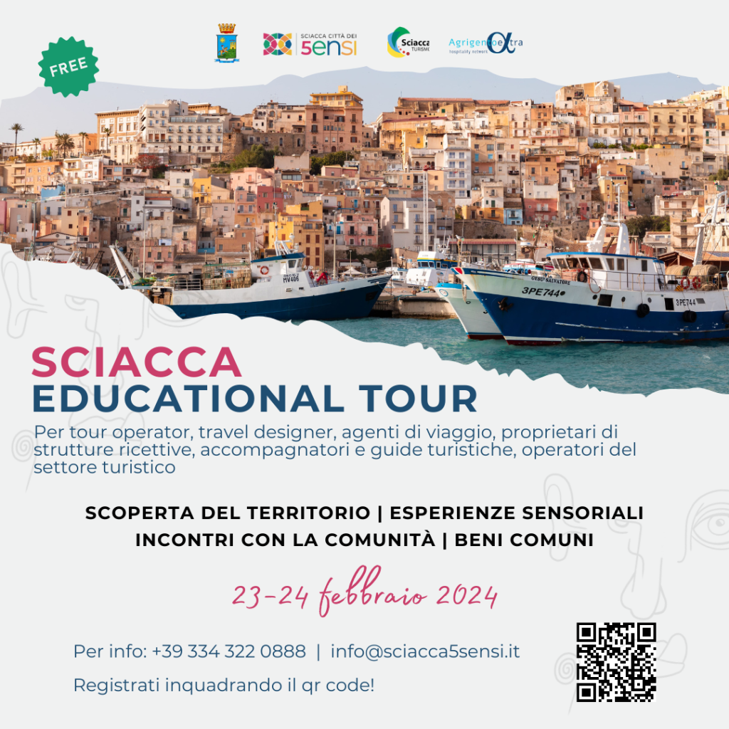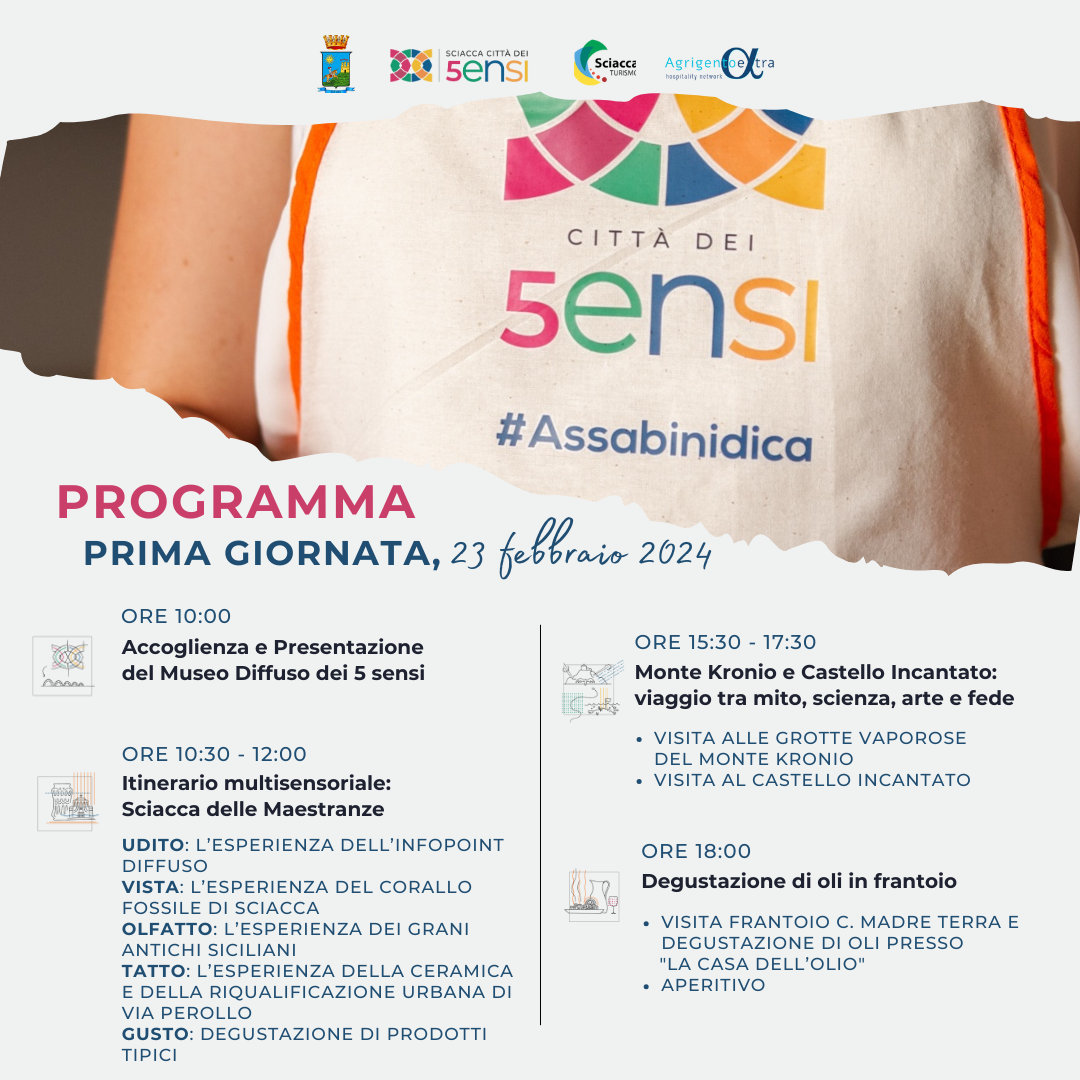 Il 23 e 24 febbraio 2024, a partire dalle ore 10:00, si svolgerà lo “Sciacca Educational Tour”, evento gratuito all’insegna del turismo e della bellezza organizzato dal Museo Diffuso dei 5 Sensi in collaborazione con il Comune di Sciacca, Agrigento Extra e Sciacca Turismo.