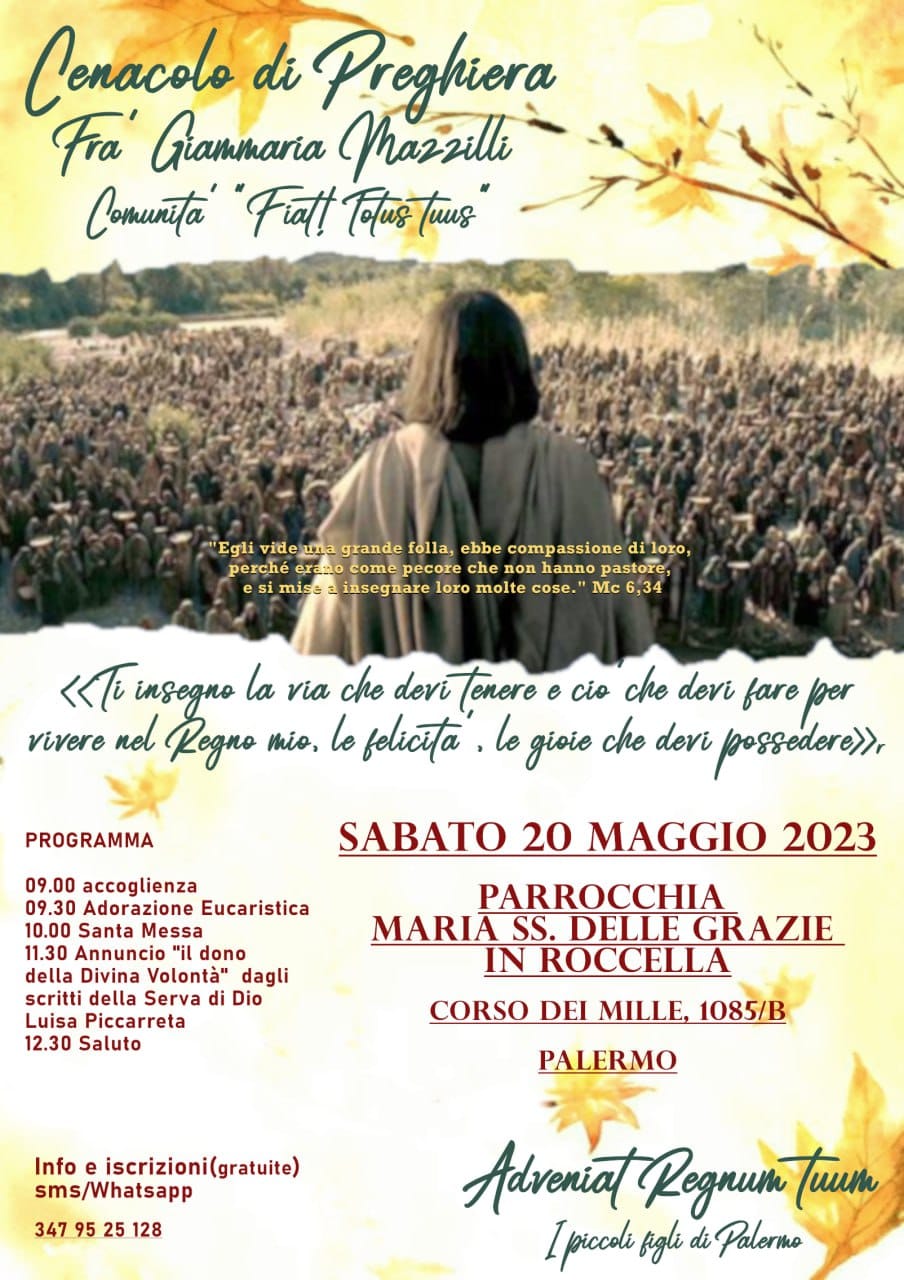 Appuntamento per sabato 20 maggio 2023 alle ore 9.00 nella Parrocchia Maria S.S. delle Grazie in Roccella, Corso dei Mille, 1085/B a Palermo. Il Cenacolo di preghiera è diretto da Fra Giammaria Mazzilli della Comunità “Fiat Totus Tuus” di Linguaglossa (CT), la mattina orante fino alle 12.30 è stata organizzata da “ Adveniat Regnum Tuum, I piccoli figli di Palermo.