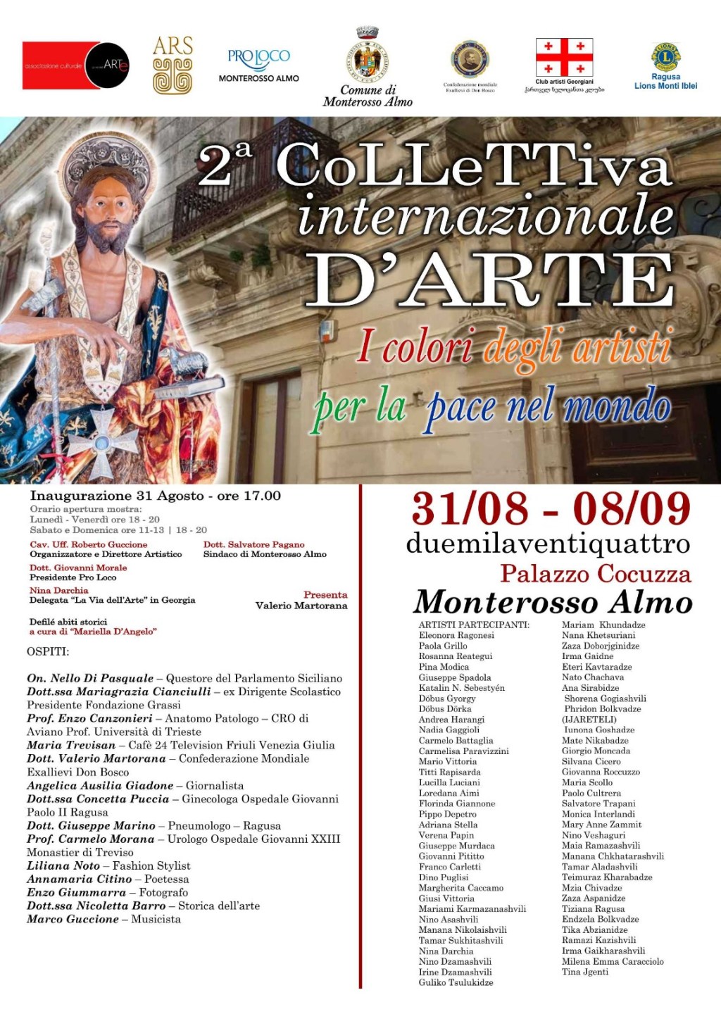 L’Associazione “La Via dell’Arte” e l’associazione turistica Pro Loco di Monterosso Almo organizzano, con il patrocinio della Confederazione mondiale degli Exallievi di Don Bosco, del club artisti Georgiani e del comune di Monterosso Almo, dal 31 agosto all’8 settembre la seconda Collettiva internazionale d’Arte denominata “I colori degli artisti per la pace nel mondo” presso i locali di Palazzo Cocuzza.