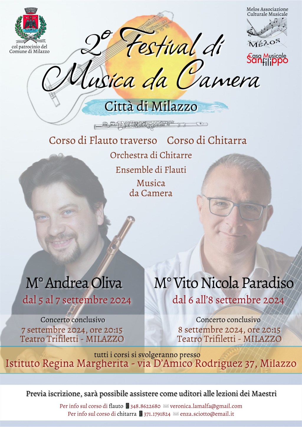 La seconda edizione del Festival di Musica da Camera “Città di Milazzo”, organizzato dall’Associazione Culturale Melos, avrà luogo tra l’istituto Regina Margherita di Milazzo ed il teatro Trifiletti dal 5 all’8 settembre 2024, con lezioni di rinomati Maestri di musica e due concerti conclusivi nelle serate del 7 e 8 settembre.