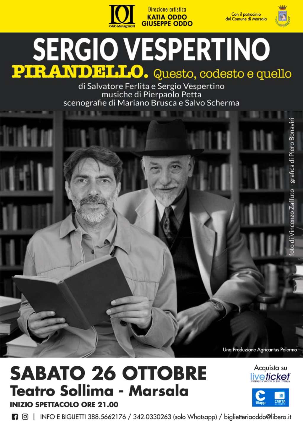 L’evento è in programma sabato 26 ottobre con inizio alle ore 21 al teatro Comunale “Eliodoro Sollima” a Marsala. Non c’è qui il “Pirandello” triste che conosciamo e che non sorride mai, ma c’è Sergio Vespertino che in un’ora racconta, soffre, ride, piange, interroga e rimprovera lo scrittore agrigentino per la crudeltà delle sue pagine che hanno tolto la tranquillità e non hanno fatto più vivere serenamente molti personaggi.