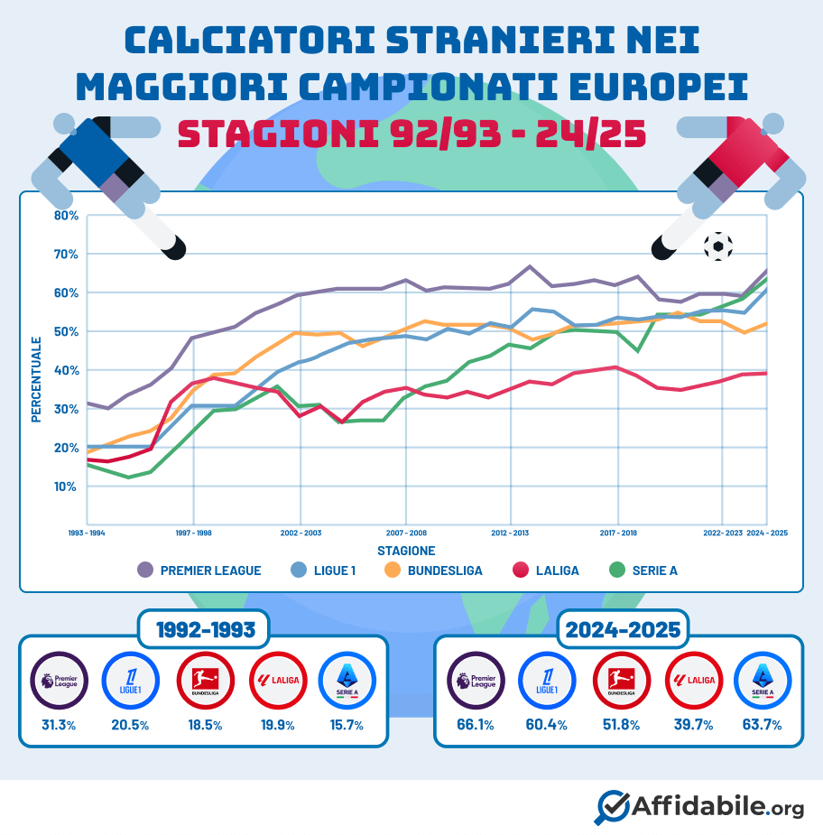Se si analizza la quota percentuale dei giocatori stranieri sul totale dal campionato 1992-1993 fino a quello più recente, in riferimento ai cinque campionati europei più importanti, appare fin da subito evidente quanto il cambiamento sia stato significativo.
