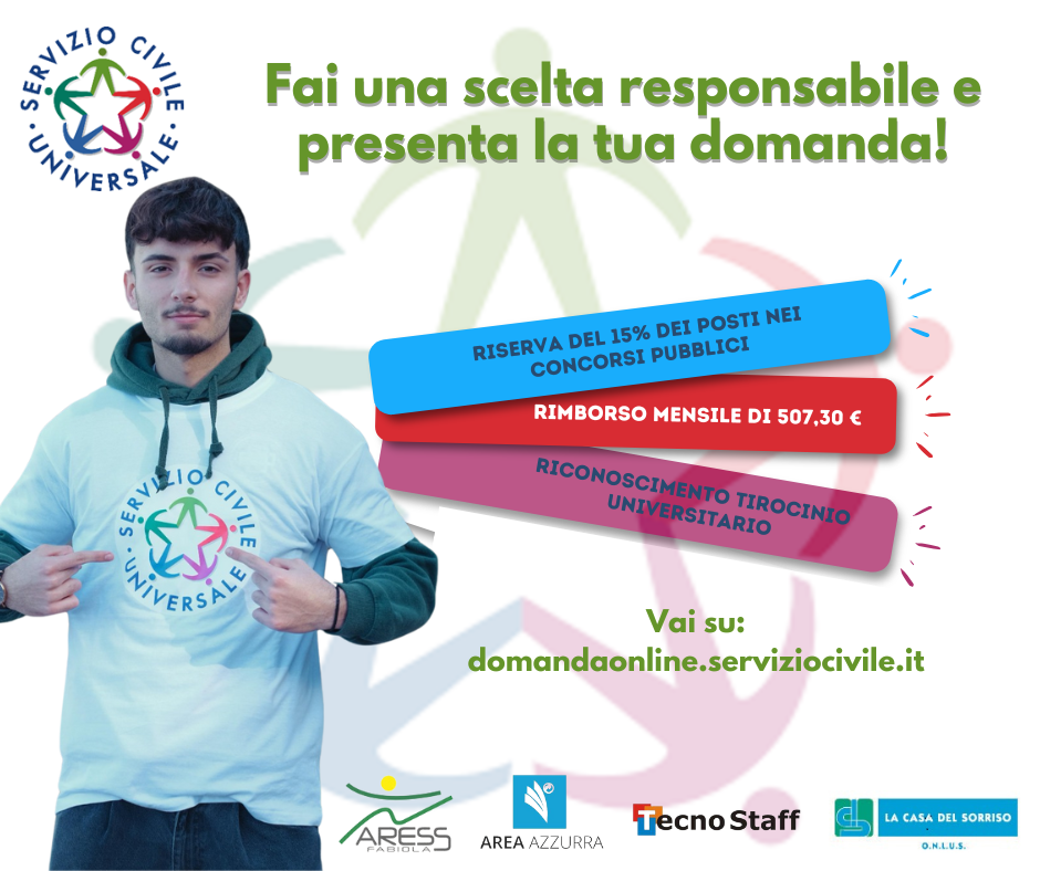 Per info su progetti, sedi e posti disponibili consultare i siti: www.aressfabiola.it, www.coopareazzurra.net e www.tecno-staff.it e www.lacasadelsorriso.org.