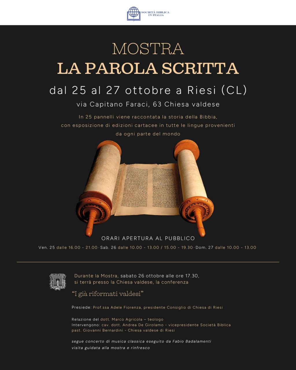 Ad arricchire l’evento, sabato 26 ottobre alle ore 17.30 si terrà la conferenza “I già riformati valdesi” del teologo Marco Agricola, presso la Chiesa valdese di Riesi in via Capitano Faraci, 63. A presiedere l’incontro sarà la professoressa Adele Fiorenza, presidente del Consiglio della chiesa; dopo la relazione interverranno il cav. dott. Andrea De Girolamo, vicepresidente della Società Biblica e Giovanni Bernardini pastore della Chiesa valdese di Riesi. La conferenza si concluderà con un concerto di musica classica diretto da Fabio Badalamenti, una visita guidata alla mostra “La Parola Scritta” e un rinfresco.