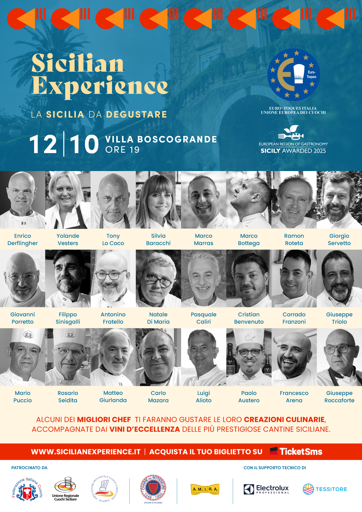 La Sicilia, crocevia di culture e tradizioni, sarà magnificata a Palermo, a Villa Boscogrande, sabato 12 ottobre nel “Sicilian Experience”, un evento ideato non solo per celebrare le meraviglie culinarie della Sicilia, ma con l’obiettivo di istituire un appuntamento, replicabile anche negli anni futuri, capace di creare comunità e catalizzare valori quali eccellenza, sostenibilità e collaborazione. Nata dal pensiero condiviso di Natale Di Maria, chef resident di Villa Boscogrande e delegato regionale dell’associazione Euro-Toques Italia, di Enrico Derflingher, presidente Euro-Toques Italia ed Euro-Toques International, e di Gaetano Basile, noto giornalista ed enogastronomo palermitano che da anni racconta la Sicilia culinaria, e realizzata in partnership con Euro-Toques Italia, “Sicilian Experience” sarà una serata conviviale che vedrà riuniti chef, cantine e produttori, tutti insieme per festeggiare l’Isola recentemente riconosciuta “Regione europea della gastronomia” per l’anno 2025 dall’IGCAT (International Institute of Gastronomy, Culture, Art and Tourism).