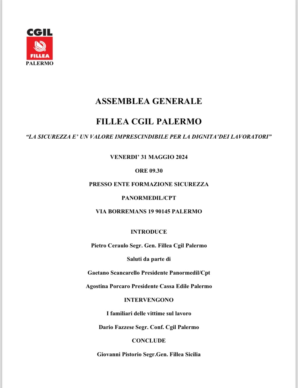 Palermo 30 maggio 2024 – A distanza neanche di un mese dalla tragedia di Casteldaccia, la Fillea Cgil Palermo ha indetto per domani assemblea alla quale sono invitati i familiari di operai edili vittime del lavoro.