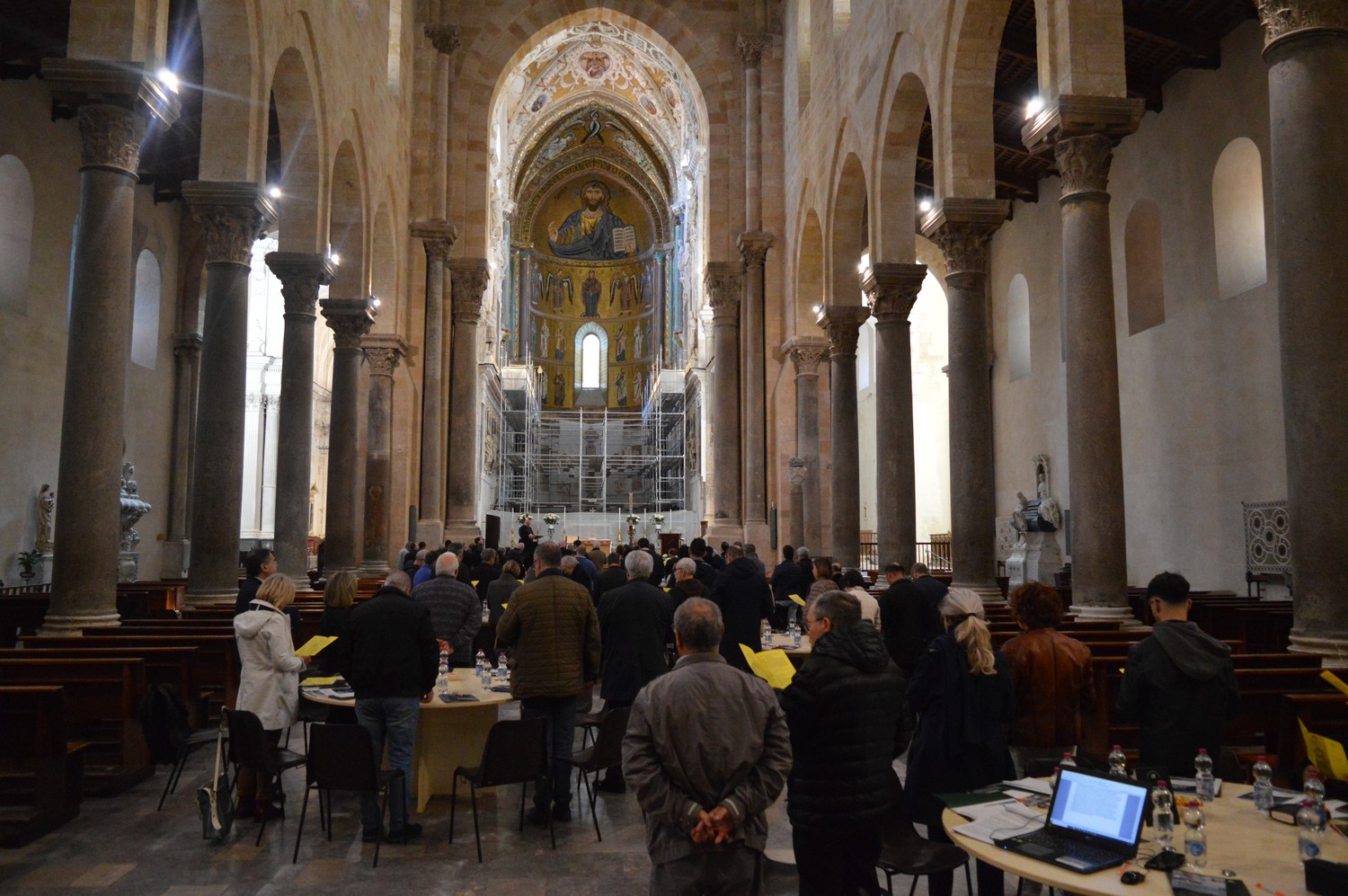 Sabato 20 aprile la Cattedrale di Cefalù ha ospitato un importante momento del cammino sinodale che la Chiesa diocesana sta vivendo. Sotto lo sguardo benedicente del Cristo Pantocratore oltre cento Sinodali si sono riuniti per discutere, riflettere e discernere le proposte sui tre temi principali dell’Unità Pastorale Sinodale, dell’Iniziazione Cristiana e della Fede Popolare e su altre tematiche, che, dopo essere state discusse e arricchite nei dieci tavoli sinodali, verranno votate dall’Assemblea Sinodale a partire da ottobre 2024.