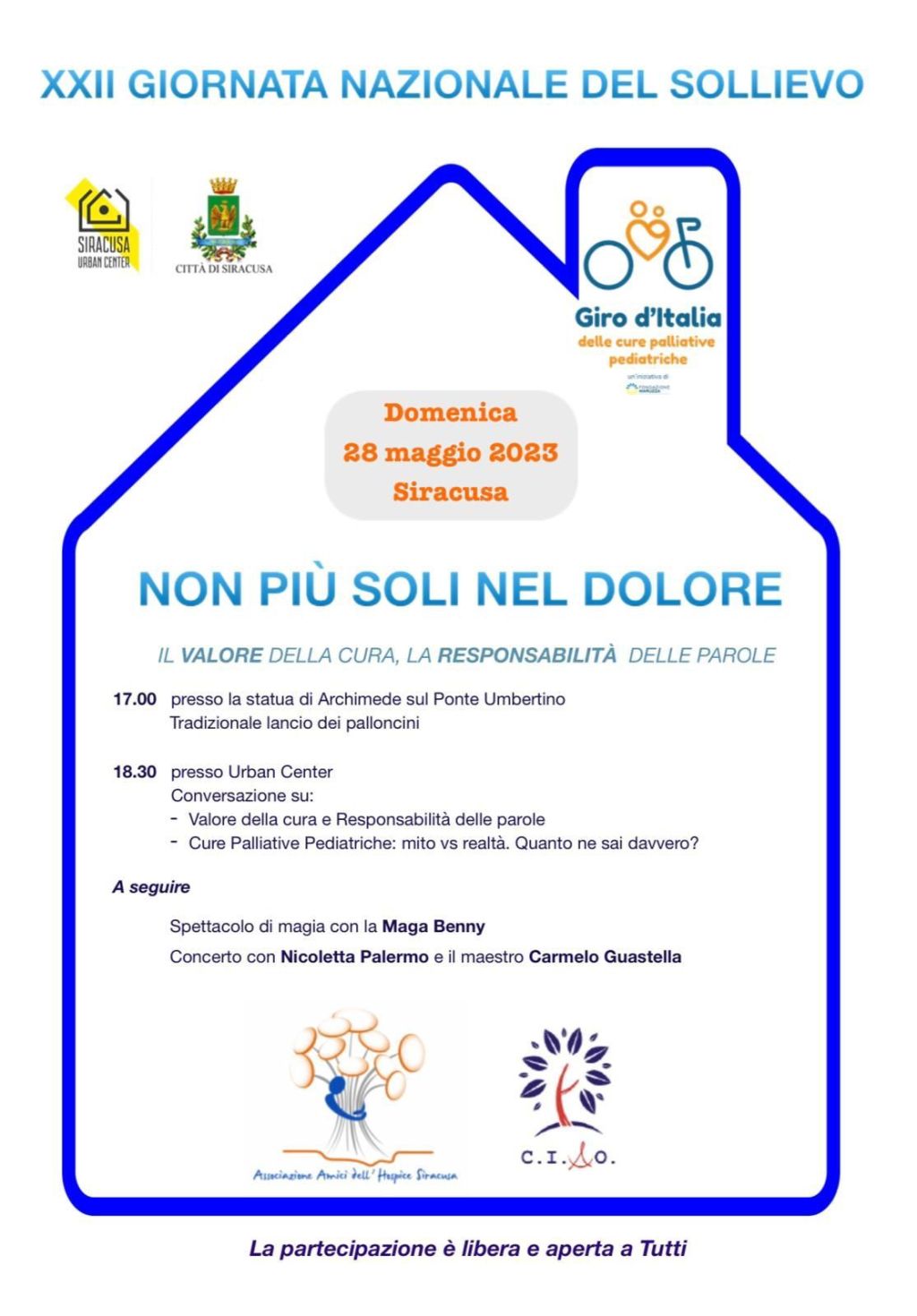 Domenica 28 maggio i volontari dell’Associazione Amici dell’Hospice Siracusa e CIAO Onlus si ritroveranno per celebrare insieme la XXII Giornata Nazionale del Sollievo. L’iniziativa, organizzata dalle due associazioni e aperta a tutti, si svolgerà presso l’Urban Center di Siracusa a partire dalle 18.30.