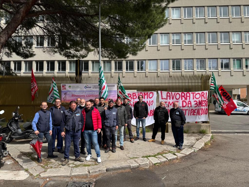 Palermo 24 marzo 2025 – Presidio dei lavoratori Tmi Facility Management, davanti alla sede di FiberCop in via Ugo La Malfa, 159. Gli operai dell’azienda che si occupa della manutenzione degli impianti di telecomunicazione di FiberCop (ex Tim) e Openfiber, sono in sciopero ad oltranza da giovedì scorso.